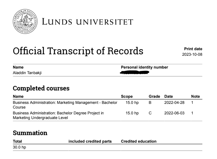 أحمل درجتي بكالوريوس في إدارة الأعمال والتسويق من جامعة لوند في السويد والمعهد العالي لإدارة الأعمال في سوريا. كما أنني حاصل على عدة شهادات معتمدة من معاهد دولية مرموقة في مجالات الإدارة، التسويق الرقمي، تصميم المحتوى، وإدارة الفرق، من أبرزها شهادة Mini MBA في إدارة الأعمال، وشهادة التسويق الإلكتروني من شركة Meta العالمية.